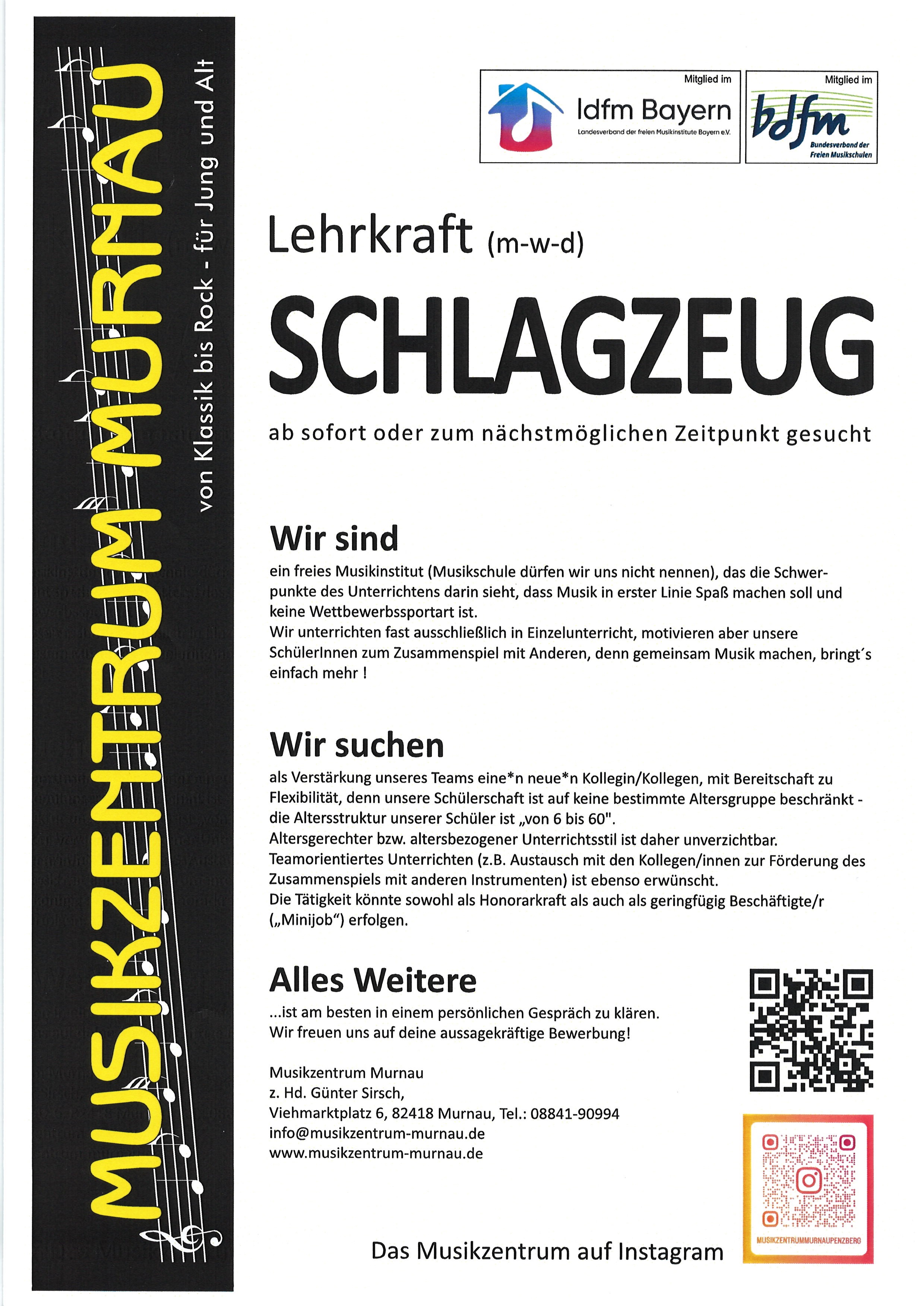 Musikzentrum Murnau sucht dringend Lehrkraft für Schlagzeug