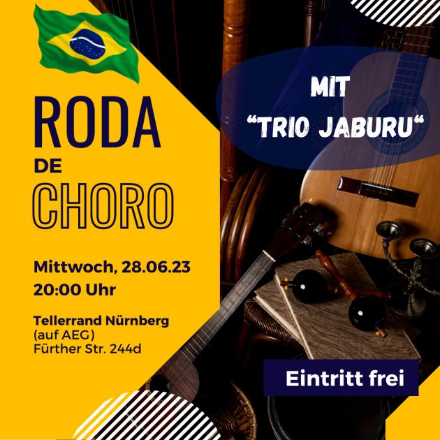 "Roda” heißt übersetzt "Runde" und in solch einer entspannten, zwanglosen Runde wird gemeinsam musiziert, getrunken und gefeiert. Dabei steht der Choro, ein traditioneller brasilianischer Musikstil, im Mittelpunkt. Um 20:00 Uhr eröffnet "Trio Jaburu" den Abend mit einem Set. Ab ca. 21:00 Uhr besteht dann die Möglichkeit einzusteigen und zusammen den Choro, Samba, Bossa, Baião und mehr zu zelebrieren. Kommt vorbei und bringt eure Instrumente/Stimme mit.