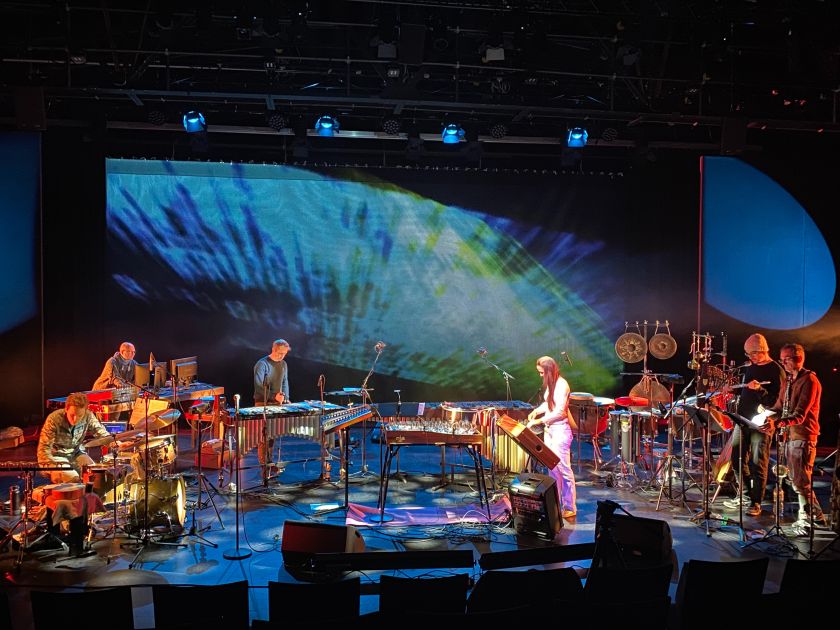 Das beeindruckende, grosse Ensemble präsentiert auf der einen Seite die Vielfalt der Schlagwerk- Familie und auf der anderen Multiinstrumentalisten, die zwischen Blasinstrumenten wie Flöten, Saxofonen und Klarinetten wechseln. Eine Konzert-Harfe, seltene Instrumente wie Glasharfe und die große Kalimba Array Mbira verbinden und runden die Musik mit perlenden Klängen, Farbigkeit und Fragilität ab. Spontane Kreativität trifft auf konzeptionelle Struktur.