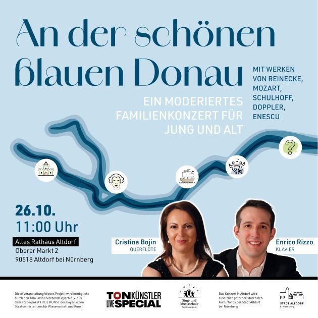 In ihrem Familienkonzert wird das Duo Rizzo-Bojin Stücke von Komponisten präsentieren, die entweder ihre biografische oder ihre künstlerische Herkunft in eines der 10 Länder entlang der Donau haben. Die Gefühle, die sie in ihrer Musik transportieren, sind so farbenfroh und unterschiedlich wie die Völker Europas selbst, und doch sprechen sie die gleiche Sprache. Sie berichten von Sehnsüchten, Leidenschaft, Liebe, feurigen Tänzen oder der stillen Verbundenheit mit der Natur.