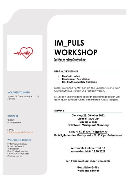 Dieser Workshop richtet sich an alle Musiker, welche ihren Grundrhythmus stärken und festigen wollen.